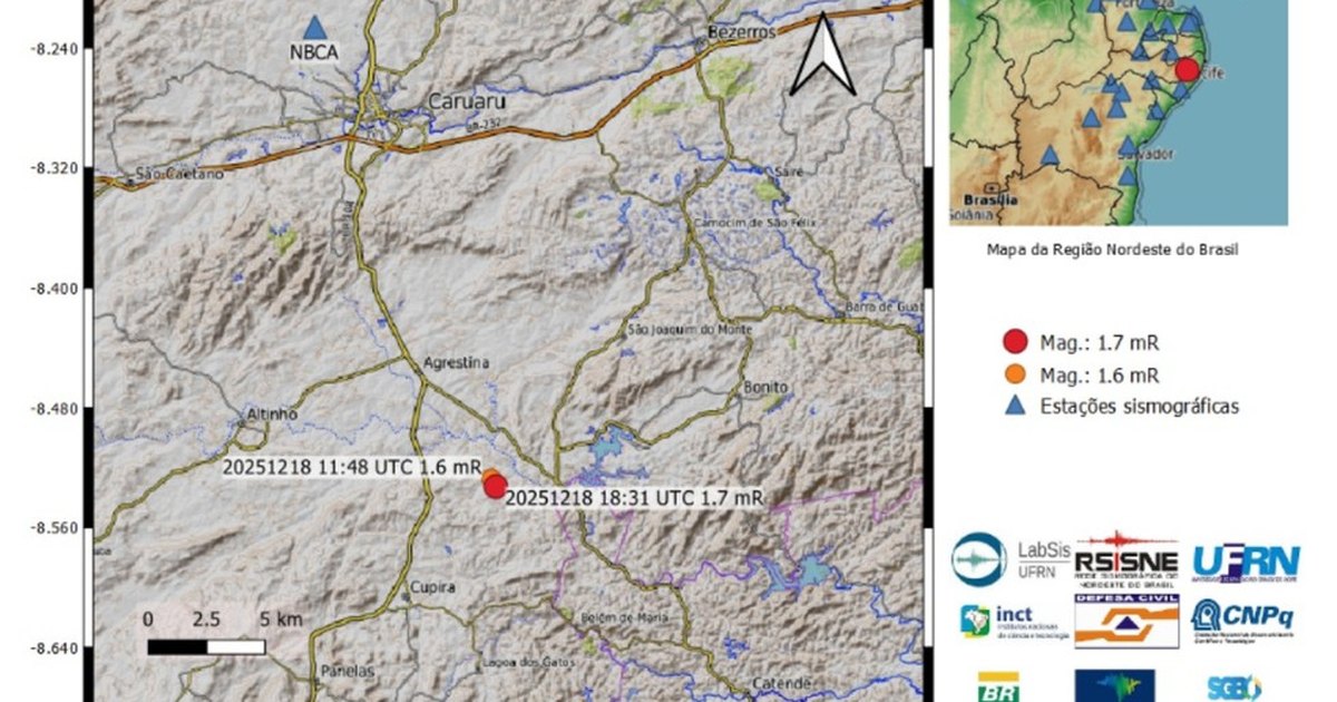 Na última quarta-feira (18), Agrestina, município situado no Agreste pernambucano, vivenciou uma sequência de tremores de terra. As informações sobre os eventos foram divulgadas pelo Laboratório Sismológico da Universidade Federal do Rio Grande do Norte (LabSis/UFRN), que monitora a atividade sísmica na área.