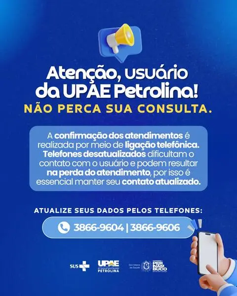 A Unidade Pernambucana de Atenção Especializada (UPAE) de Petrolina faz um alerta importante: usuários devem manter seus dados cadastrais, especialmente o número de telefone, sempre atualizados. Essa prática é essencial para assegurar a comunicação eficaz e a confirmação de consultas, cirurgias e exames.